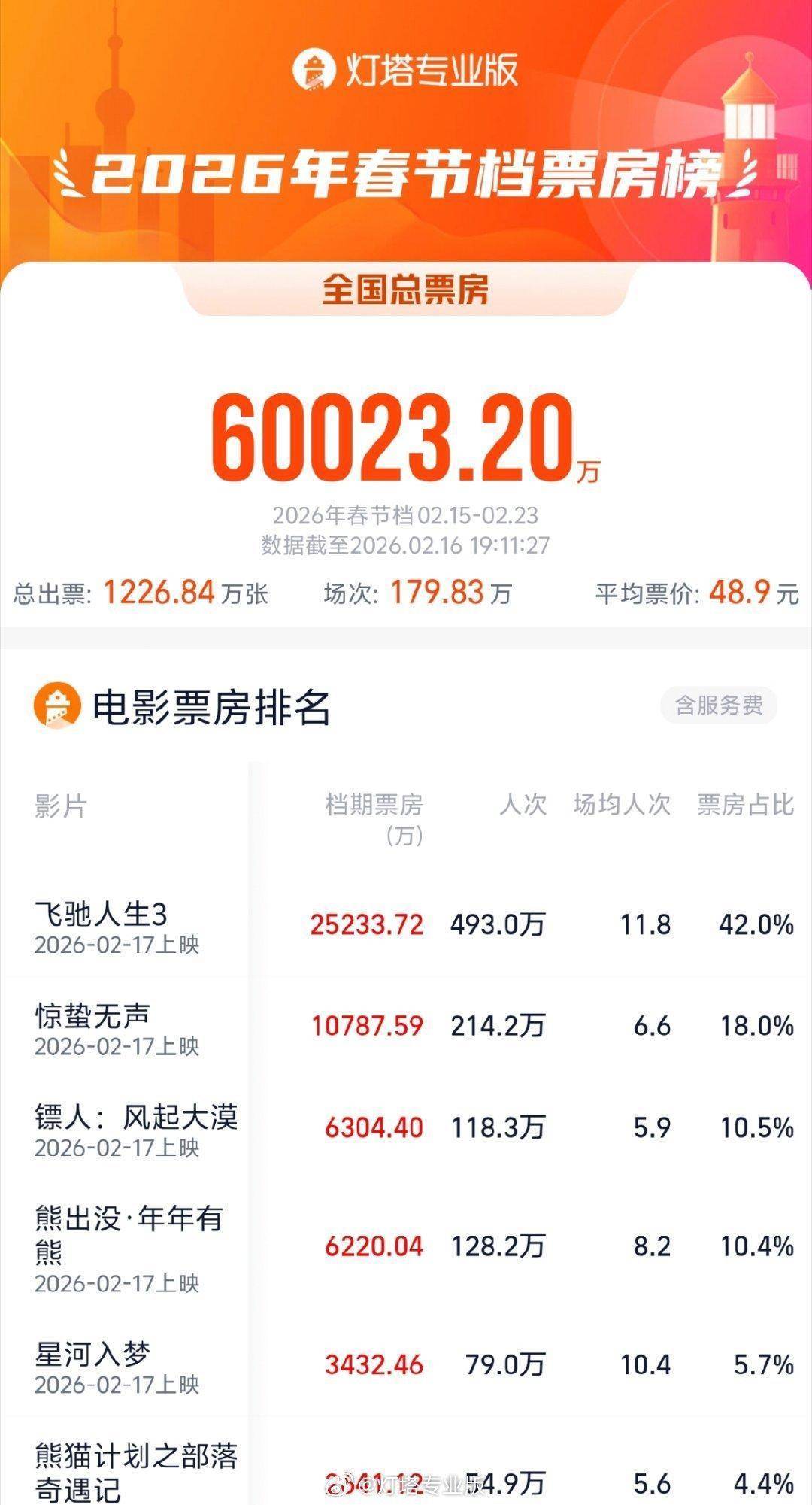 据灯塔专业版,截至2月16日19时11分,2026春节档(2月15日-2月23日),档期总票房(含预售)突破6亿。
