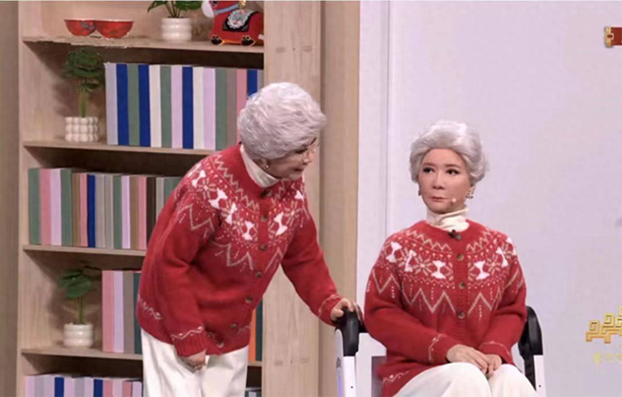 三十年前,央视春晚舞台上的小品《机器人趣话》中,机器人“菜花”第一次在观众的脑海中构建了人形机器人的想象。三十年后,当年“菜花”的扮演者蔡明与一个和她容貌神态几乎一致的仿生人形机器人,还有四位可爱的“机器人孙子”一起同台。