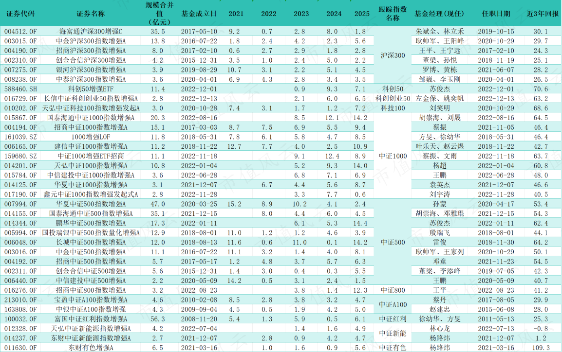 而与这类高弹性品种相比,沪深300指数增强产品的近三年回报多集中在25%至30%之间,体现出较强的抗周期韧性;规模达56.3亿元的富国中证红利指增A,则以25%的三年回报,印证了“红利+增强”策略在震荡市中的压舱石作用。