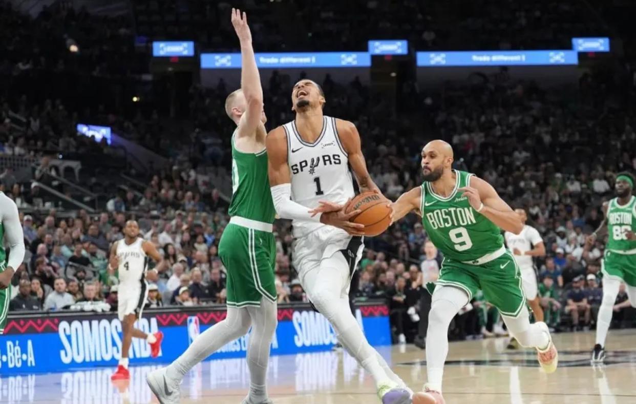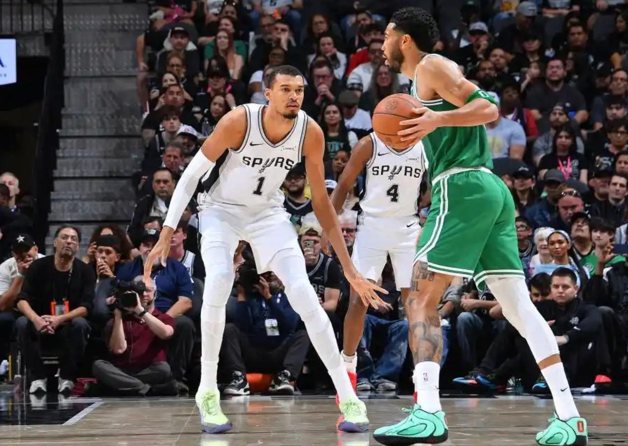 有关文斑亚马防守的尬吹,经过今天这场,也能消停消停了。哪一名NBA最佳防守球员,会像今天的文斑亚马那样狼狈?对位空间型中锋,文斑亚马是懒惰的,是目送加尔扎空位投篮的。防守凯尔特人的投篮战术,文斑亚马是缺乏预判的,是屡次会被“flare掩护”钻空子的。换防凯尔特人的外线射手,文斑亚马是会被军训的。整场比赛,他被杰伦·布朗一步突掉过,被大伤初愈的塔图姆,当“狗”一样在遛。甚至,身高仅有1米94的怀特,都能靠节奏,把文斑亚马突得予取予求。怀特今日战旧主,在三分手感不佳,全场11投仅3中的情况下,还能疯狂砍下34分,文斑亚马拙劣的防守功不可没。
