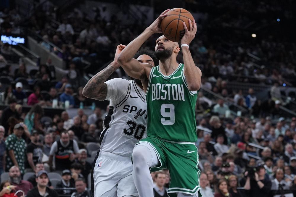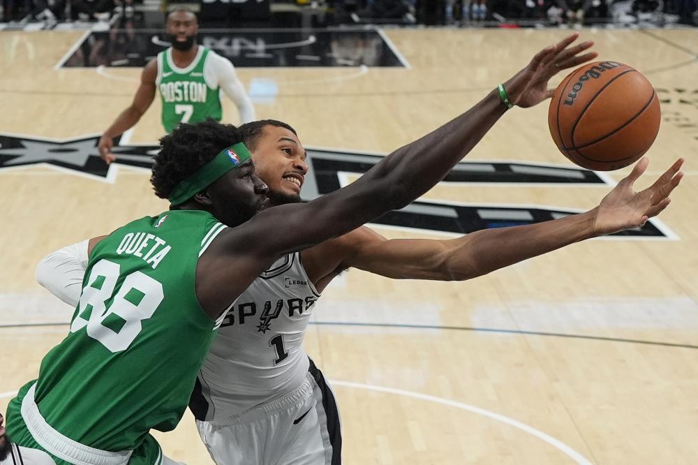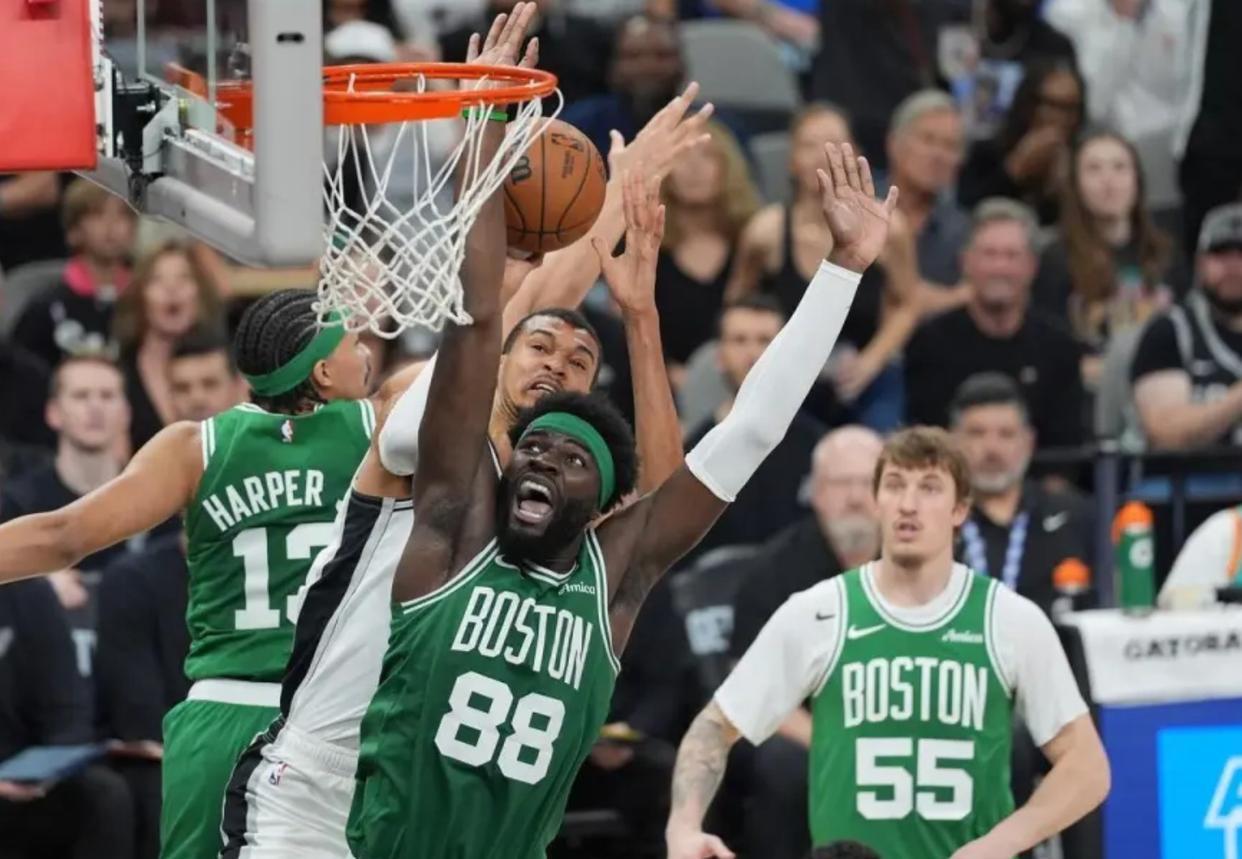 这就不难理解,凯尔特人今日的中锋轮换。奎塔作为“黑又硬”,更有可能拦住马刺天赋冲击的那名球员,反而和文斑亚马错开了上场时间。每当文斑亚马被换上场,加尔扎,凯尔特人的白人替补中锋,立马跑到技术台前待命,时刻准备上场。甚至,凯尔特人宁愿用豪瑟,一名白人锋线射手去打中锋,都不愿意让奎塔上场。这是为什么?把射术拉满,把空间拉开,把憨憨的法国人,暴露在近乎癫狂的三分火力之下,在客场去搏一个赢球的机会。这就是凯尔特人今天的策略。