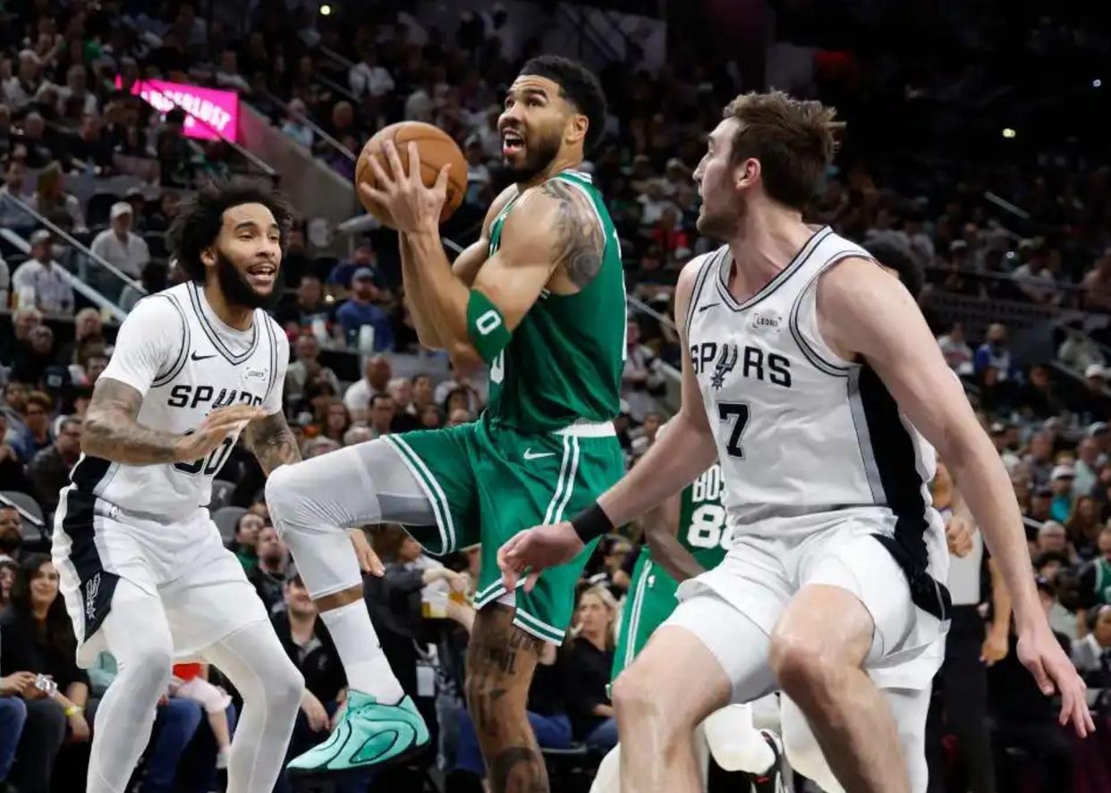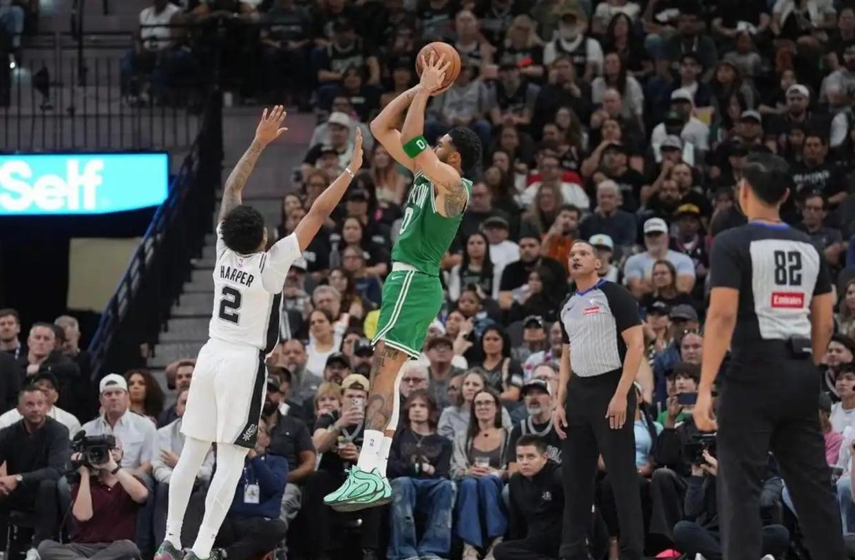 在赛前的策略制定上,凯尔特人今天是有点“疯”劲的。他们知道,就算再怎么努力,也很有可能防不住马刺。内线就这么点人,锋线人手也不富裕。奎塔一上来就被文斑亚马的身高给压制住了,天赋平庸的加尔扎,又怎么可能是文斑亚马的对手?既然怎么防,都不可能防得住,凯尔特人今天压根就没想过防守这件事。他们把全部的赌注,押在进攻,押在自己的三分火力上。比赛的核心重点,就是用三分的火焰,把文斑亚马射成筛子。