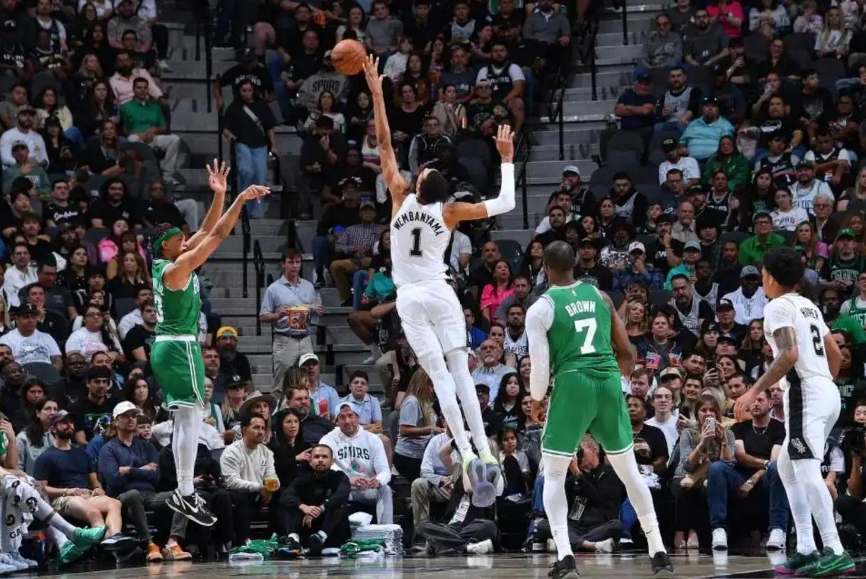 三分球只要扔得多,就算是瞎猫碰到死耗子,也能把数据“刷”上去。类似今天这样,文斑亚马在凯尔特人对其“半放弃防守”的环境里, “刷”得兴起。2米24的大高个,全场扔了多达15记三分,命中8记,全场得到了39分。数据很夸张。但有没有球迷想过一个问题。如果文斑亚马把一半的三分出手,转化成内线扣篮,用身高在篮下暴击天赋平庸的加尔扎。或许,文斑亚马的数据就不会像现在这样好看,但会不会,马刺能赢得更轻松,不需要把胜负的悬念拖到最后一分钟才揭晓呢?